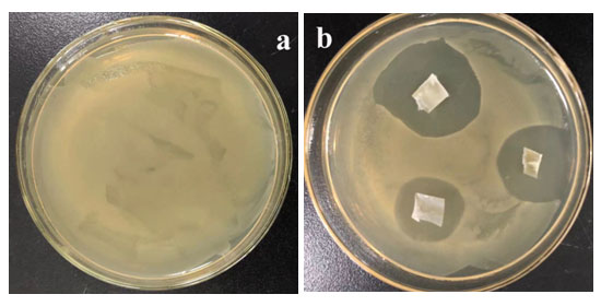 圖1. 培養(yǎng)基培養(yǎng)24小時后抗菌水管抑菌圈測試效果圖(a:對照樣;b:放置抗菌水管片樣)