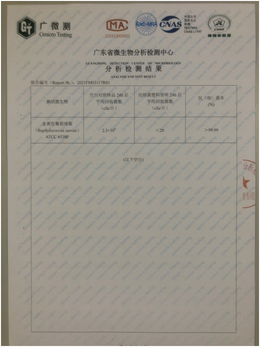 圖2是委托具備CMA、CNAS等資質(zhì)的廣東省微生物分析檢測中心檢測,依據(jù)JC/T939-2004標準測試其抗菌性能得到的測試結(jié)果。測試結(jié)果表明,經(jīng)24小時后,抗細菌塑料管樣抗菌率達到99.99%以上,說明我們的抗菌水管具備優(yōu)良的抗細菌性能。